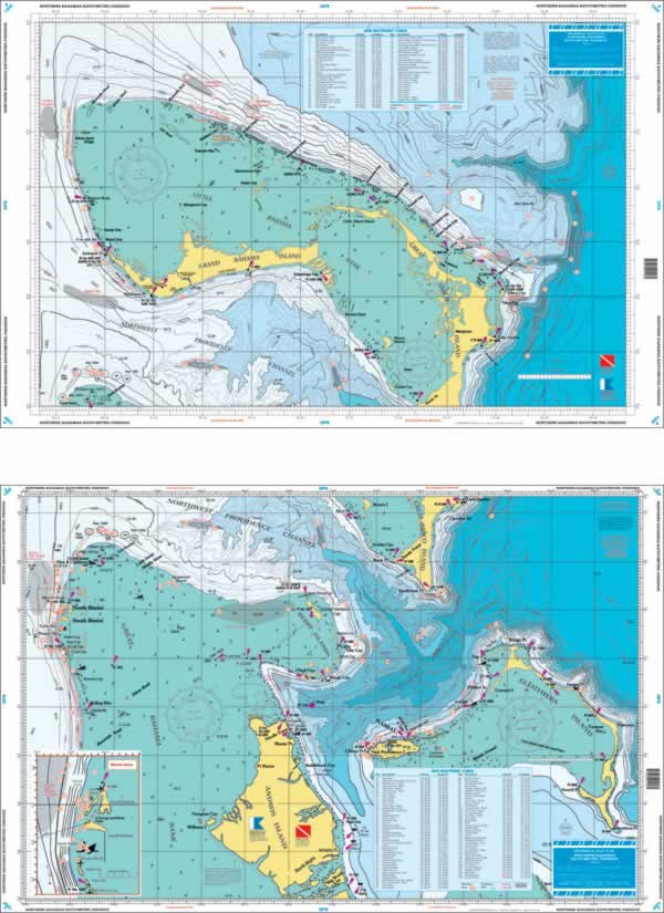 Northern Bahamas Bathymetric Fishing. Features fishing and diving information available from no other source. Exceptional bright colors make this chart easy to read and excellent for framing and hanging at home or office. The best Bahamas fishermen contributed to this chart. Deepwater contours surrounding the major islands of the Northern Bahamas with coverage from Walkers Key, Grand Bahama and the Little Bahama Bank to Cherokee Sound, Abaco on the North Side. Also includes coverage from Great Issac, Bimini and Hole in the Wall, Abaco southeast to Chub Cay, Nassau and Eleuthera on the south side. Major deepwater fishing areas for Wahoo, Tuna, Dolphin and Marlin with their LOCAL names and GPS positions. Detailed inset for Bimini with both shallow and deep dive sites and wrecks with several "deep dropping" areas. A total of 129 GPS Waypoints! Information from 4 NOS charts. 1984 GPS Datum.