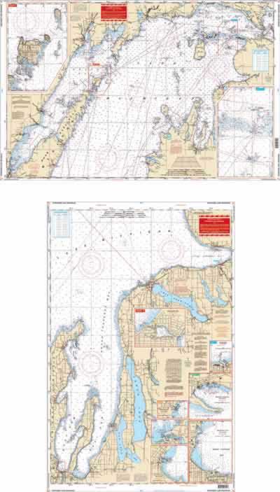 Overall coverage of the northern section of the lake from Frankfort, Michigan and Green Bay, Wisconsin, north to the Straits of Makinac. Provides details for the Grays Reef Passage and the Washington Island, Wisconsin area. Covers all of Green Bay and Door County. The reverse side covers the Grand Traverse and Little Traverse Bay area, with detailed harbor insets for Traverse City, Suttons Bay, Elk Rapids, Northport, Harbor Springs, Petoskey and Charlevoix. Information compiled from 5 NOAA Charts: 14902, 14909, 14911, 14913, and 14942. GPS datum.