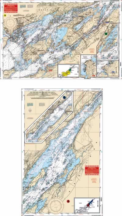 The Thousand Islands. A great combination of several goverment charts. From Wolfe Island, this chart covers the Clayton and Gananoque area east to Wellesley Island, Hill Island, and Alexandria Bay. Provides details of Clayton, Alexandria Bay. The reverse side covers the seaway from Dingman Point, northeast to Brockville and Morristown, New York. All you need for this popular summer area. Color key and large print place names make this chart exceptionally easy to use. Information from 4 NOAA Charts: 14767, 14766, 14765, and 14764. GPS Datum.