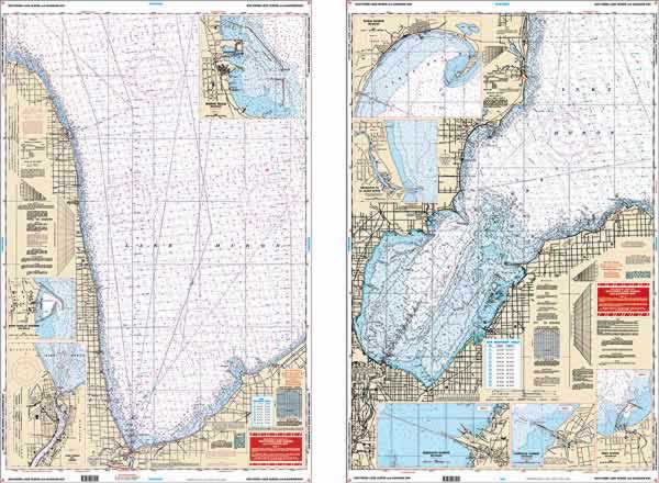 Coverage from Port Huron north along the Mighigan Shore to north of Harbor Beach with details of Port Huron, Harbor Beach, and Sanilac Harbor on one side. The reverse side has complete coverage of Saginaw Bay to Bay City, north to Au Sable, with enlarged detailed harbor blow ups for Port Austin, Caseville Harbor, Sebewaing Harbor, Oscoda, and Tawas Bay. Information from 3 NOAA Charts: 14863, 14862 and 14852