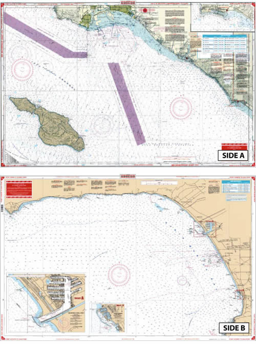 From Pt. Dume and Paradise Cove, covers area south to Dana Point Harbor and out to Catalina. Harbor Details for Dana Point, King Harbor and Marina Del Rey. Fueling facilities designated. information from 2 NOAA Charts; 18744 and 18746. 25" x 38"